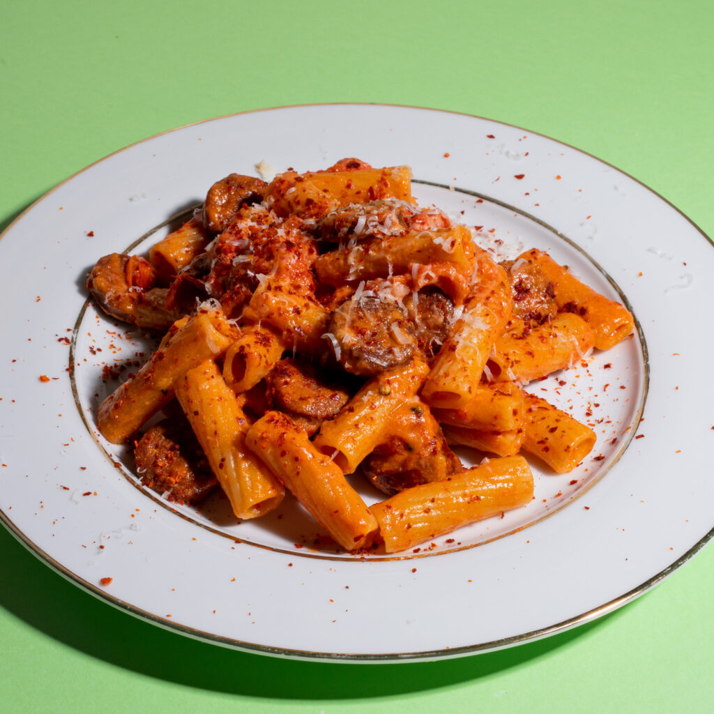 In a saucepan, toss the pasta through the tomato mixture with the chorizo. Place it over a very low heat and add the egg mixture, stirring constantly, cooking it out until it has thickened up.