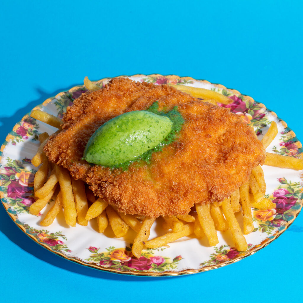 • Dip the breast in the flour, then the eggs, then the panko. Fry the schnitzel in the oil until crispy and cooked through.